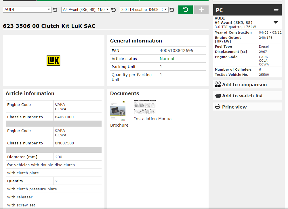 Λοιπον 240mm ειναι του 3.0tdi FWD ενω του quattro ειναι 230mm οποτε ισως να ειναι απο quattro αυτο που εβαλες που σημαινει οτι αντεχει και το ξυλο.. Παρακατω ειναι και φωτο απτο site της LUK...